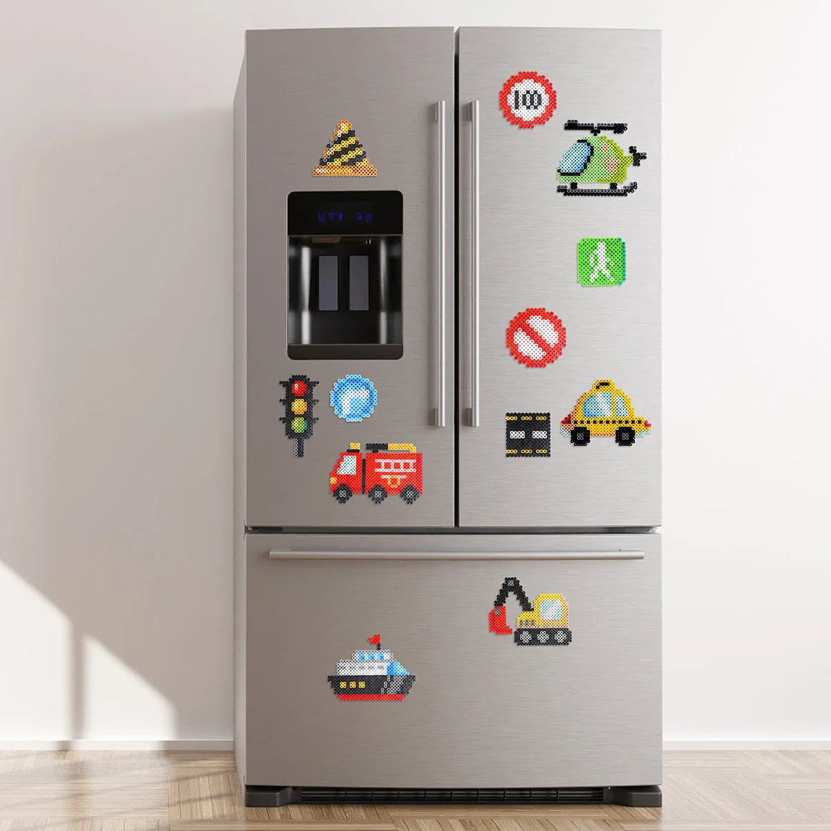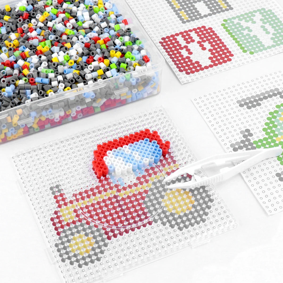 - 【Abundant Iron Beads Kit】Fuse beads set with various accessories: Approximately 5000 fuse beads (5mm) in 13 colors, 18 transport-themed pattern templates, transparent square pegboards, 18 pendants, 2 ironing papers, 1 tweezer, and 1 storage box.