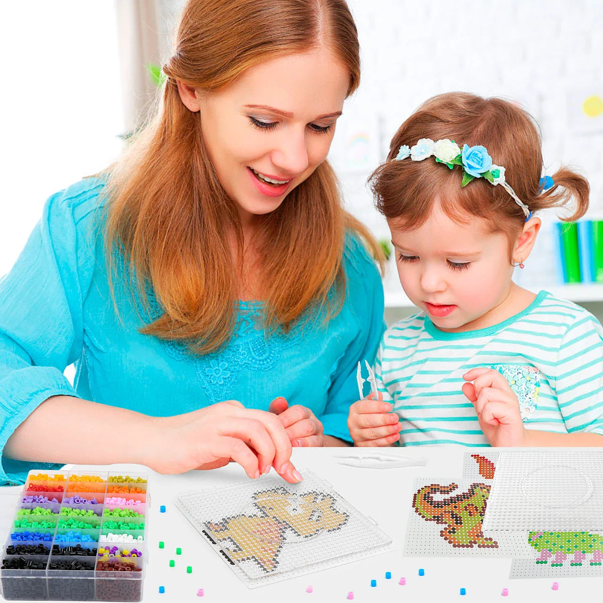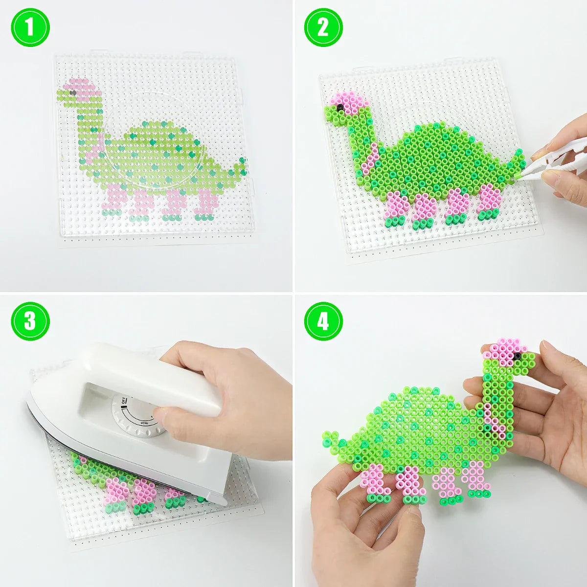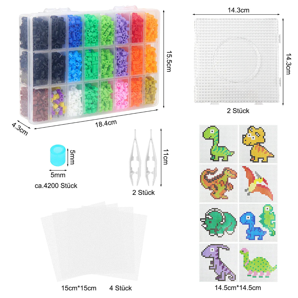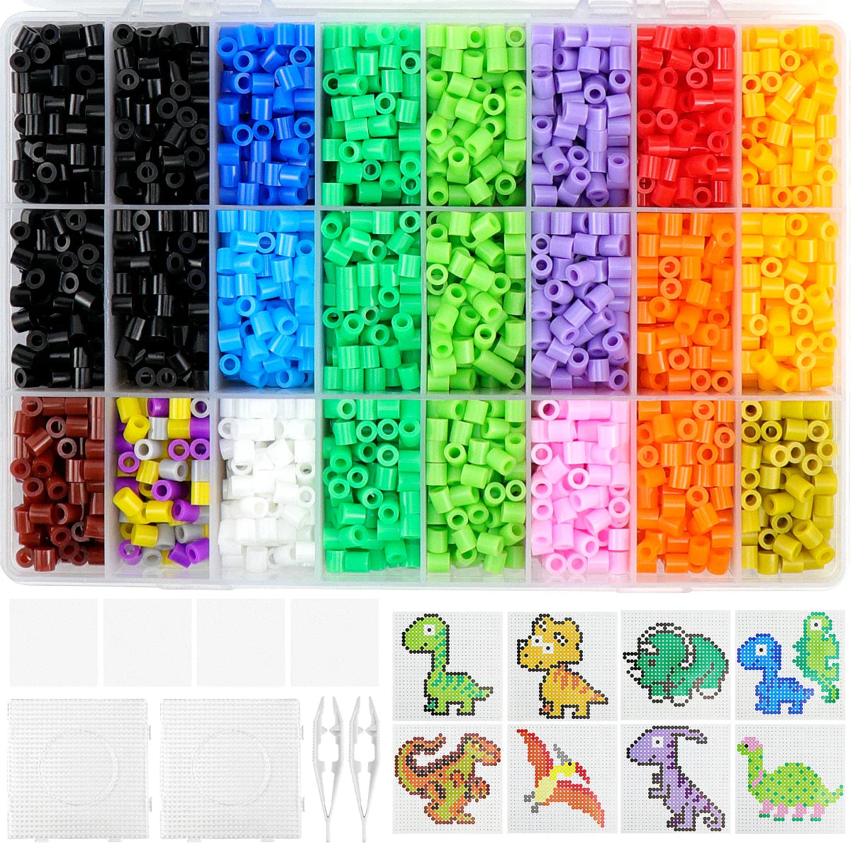 - Package Contents: The Perler Bead set comes with a variety of accessories: approximately 4200 Peg Beads (5mm in diameter), 9 dinosaur-themed pattern templates, 2 transparent square pegboards, 4 pieces of ironing paper, 2 pairs of tweezers, and 1 storage box.