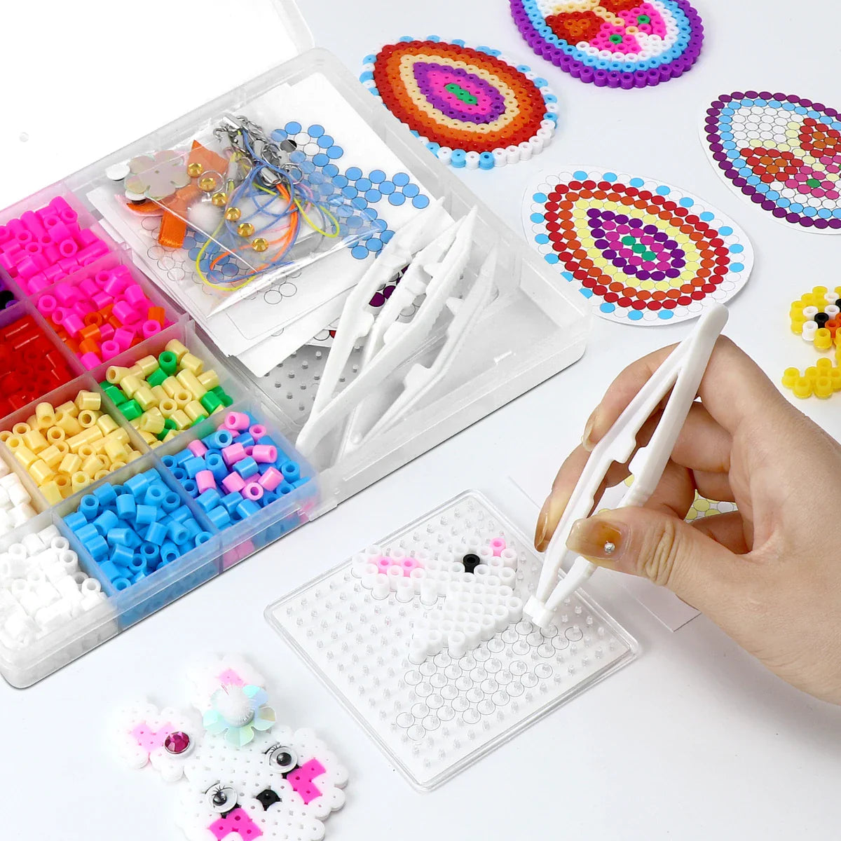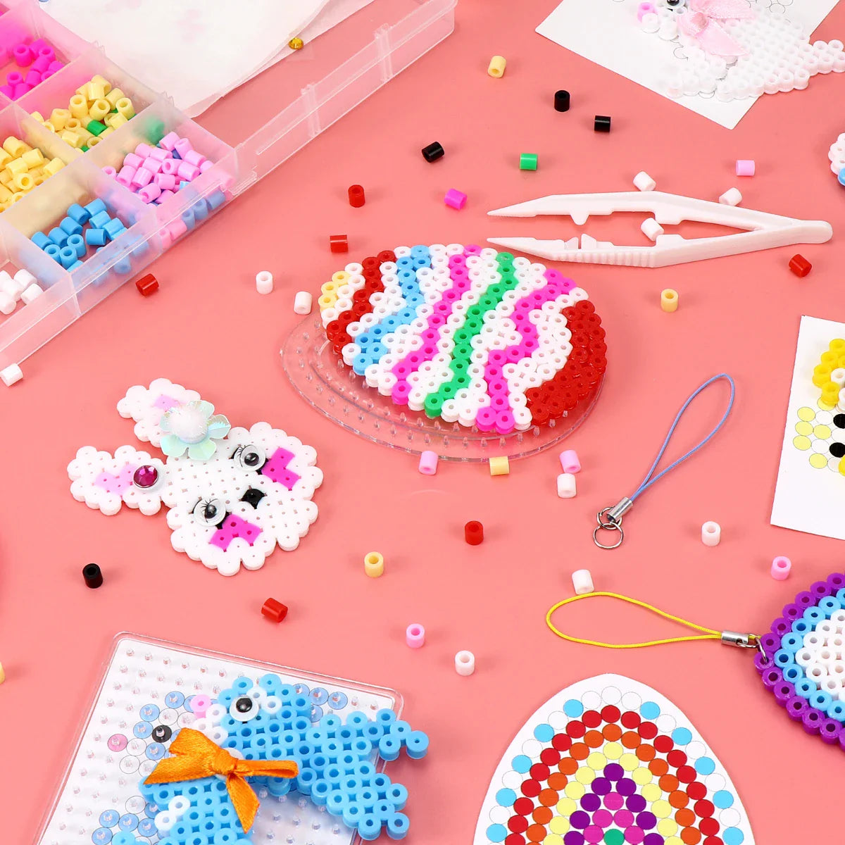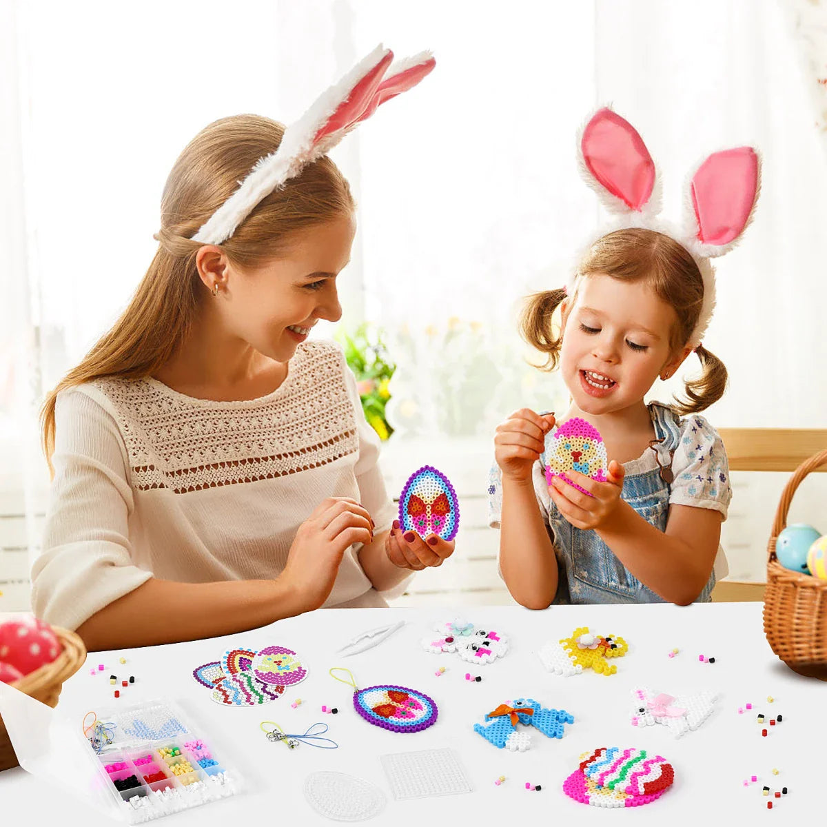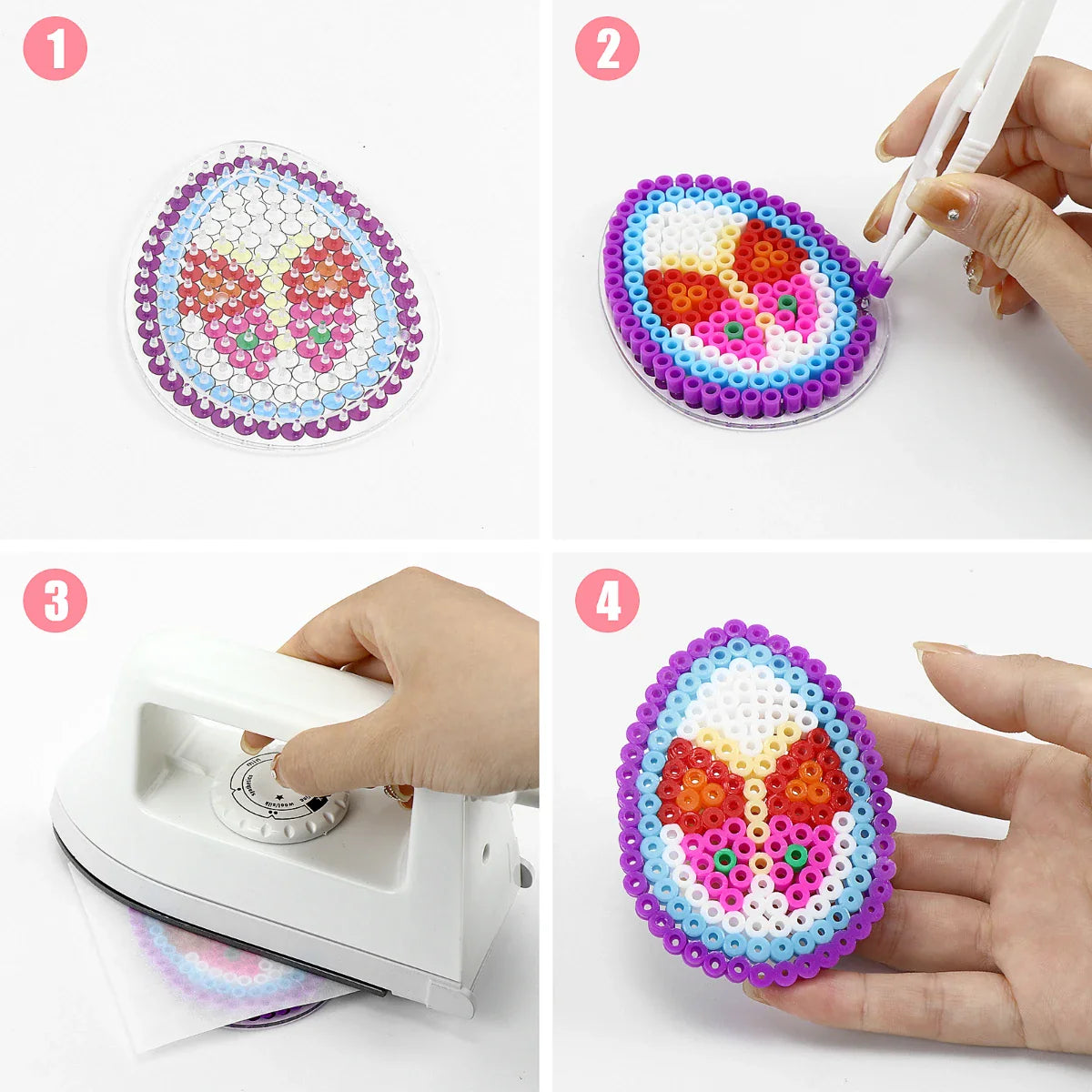 - Package Contents: The Easter Perler Bead set comes with a variety of accessories: approximately 1200 Peg Beads (5mm in diameter) in 8 colors, 8 Easter-themed pattern templates, 1 transparent square pegboard, 1 egg-shaped pegboard, 8 charms, 4 pieces of ironing paper, 2 pairs of tweezers, 1 storage box and some decorative accessories.