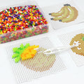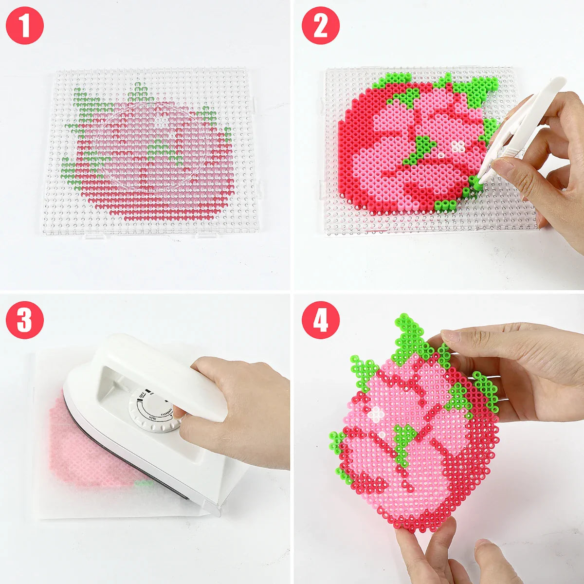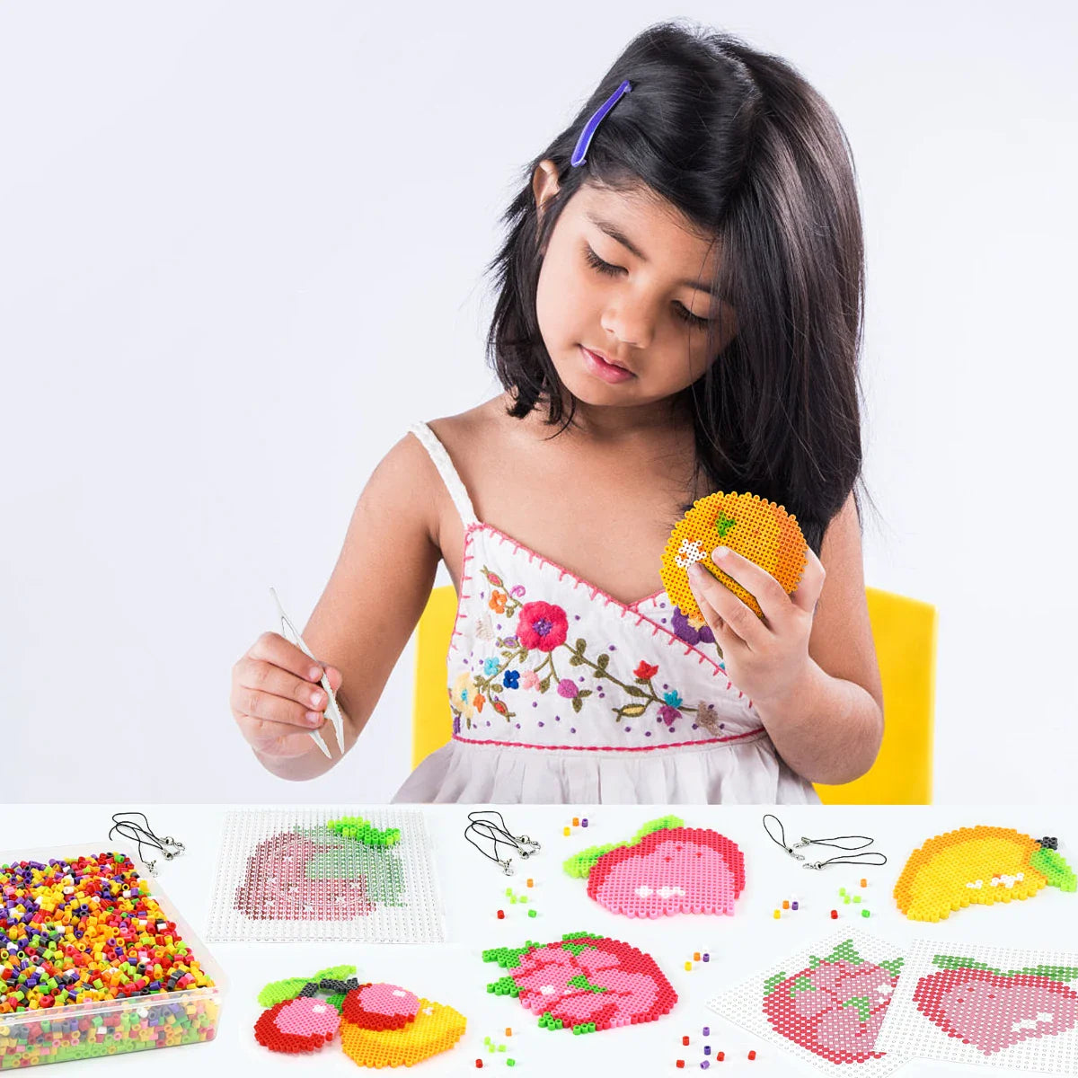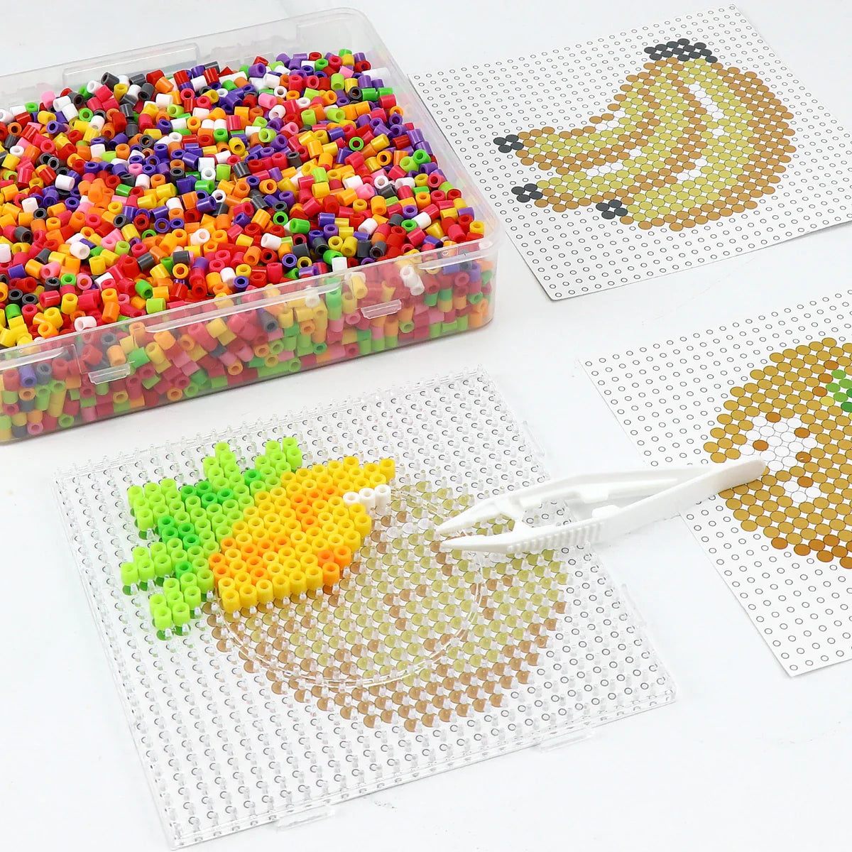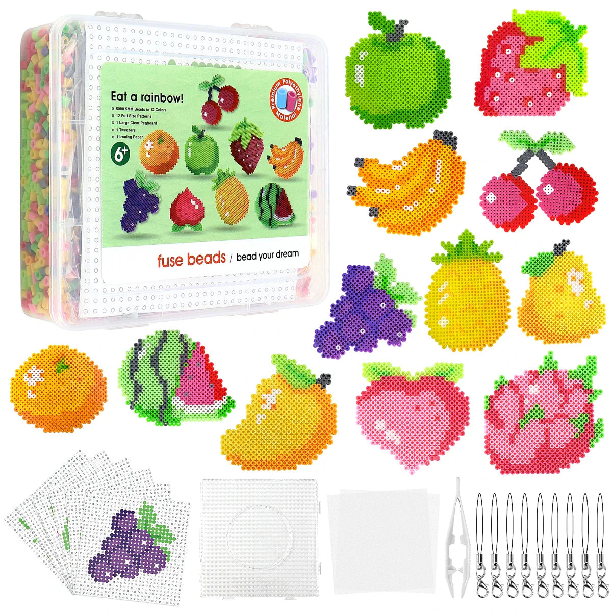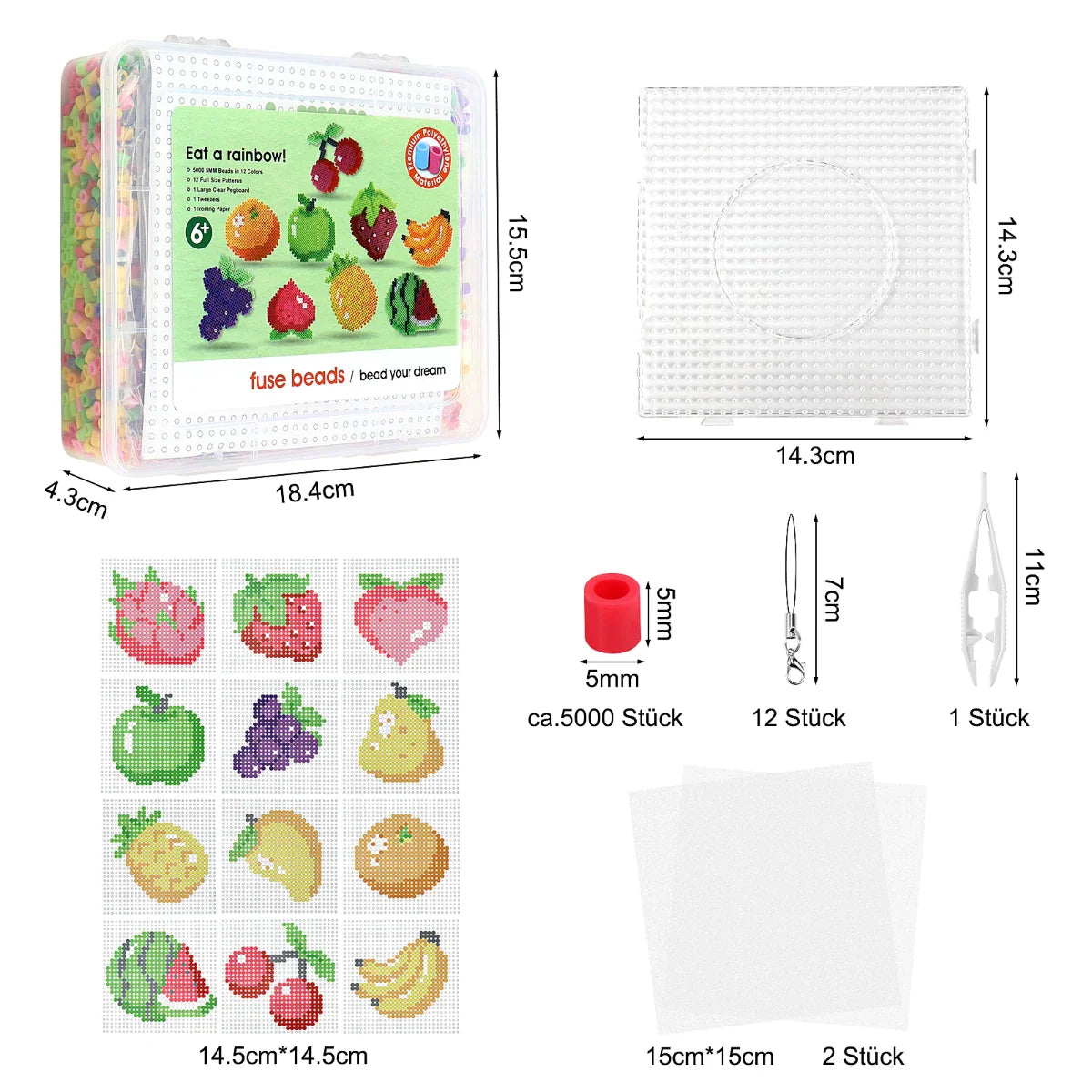 - Package Contents: The Perler Bead set comes with a variety of accessories: approximately 5000 Peg Beads (5mm in diameter) in 22 colors, 15 fruit-themed pattern templates, transparent square pegboards, 15 charms, 2 pieces of ironing paper, 1 pair of tweezers, and 1 storage box.